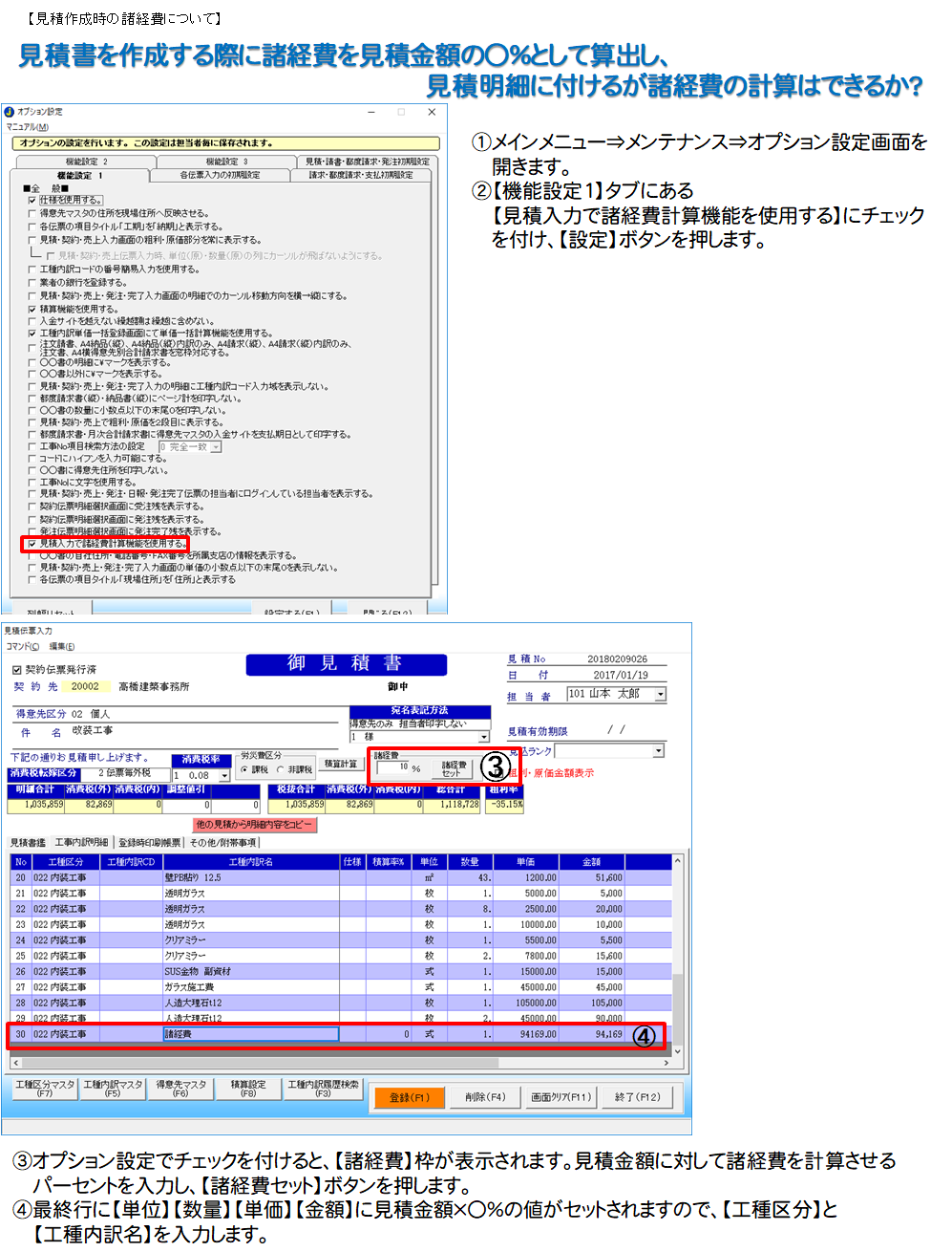 - 見積書を作成する際に諸経費を見積金額の〇%として算出し、見積明細に付けるが諸経費の計算はできるか?