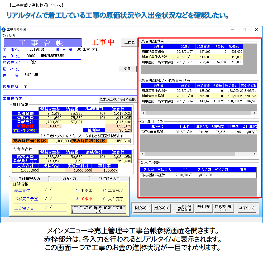 工事台帳画面でリアルタイムに発注/完了状況・入出金状況・全体的な粗利状況が確認できます。