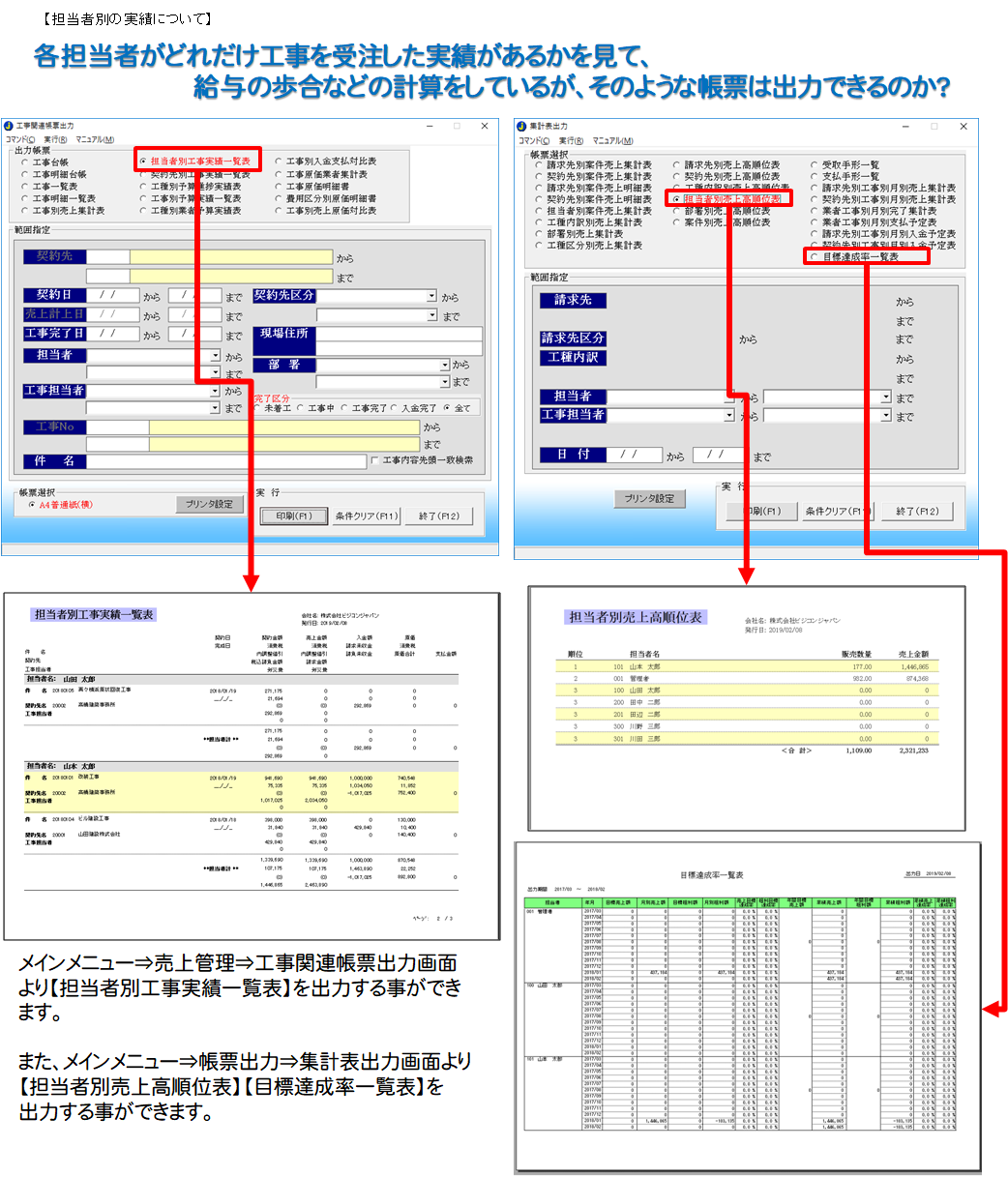 - 各担当者がどれだけ工事を受注した実績があるかを見て、給与の歩合などの計算をしているが、