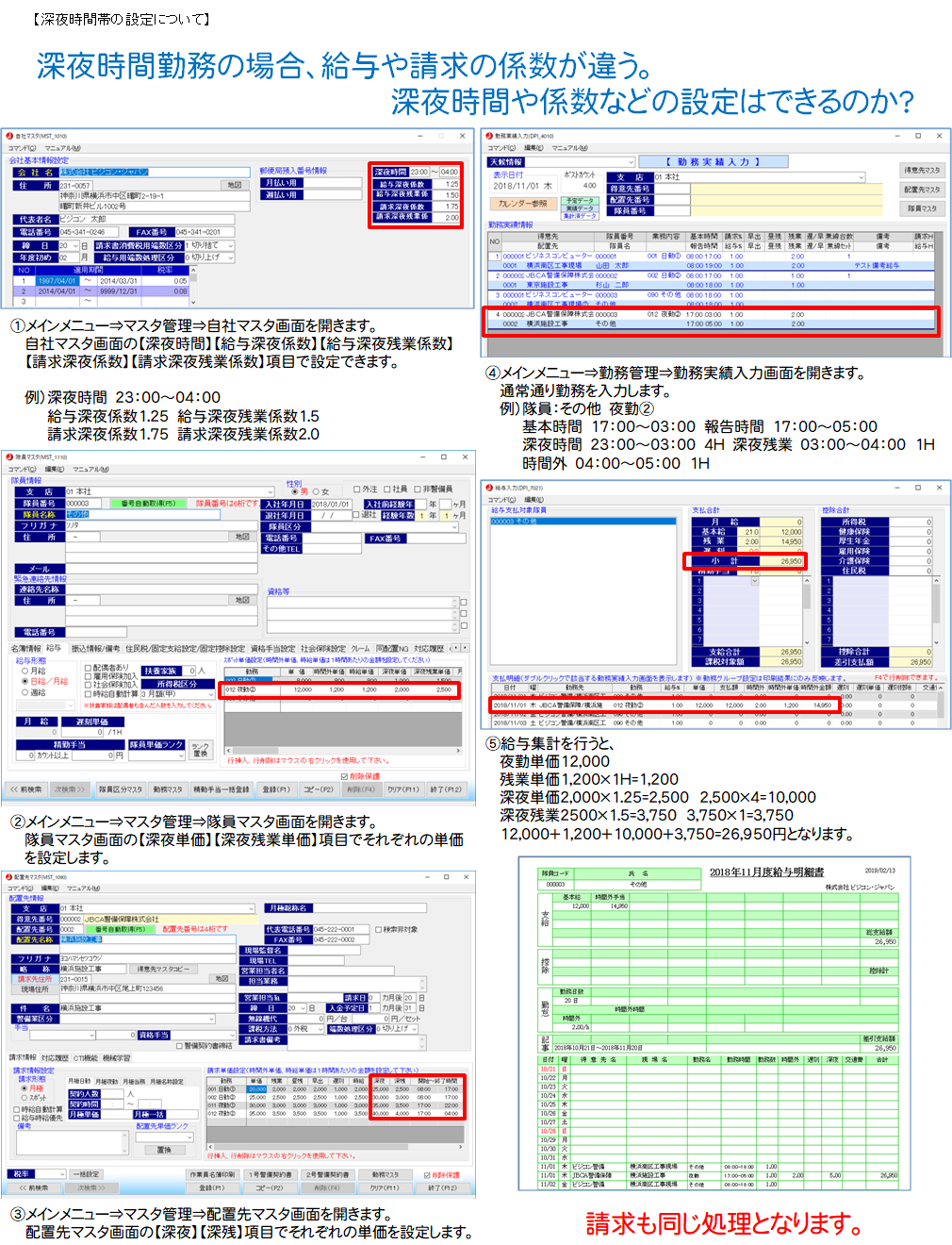 - 深夜時間勤務の場合、給与や請求の係数が違う。深夜時間や係数などの設定はできるのか?