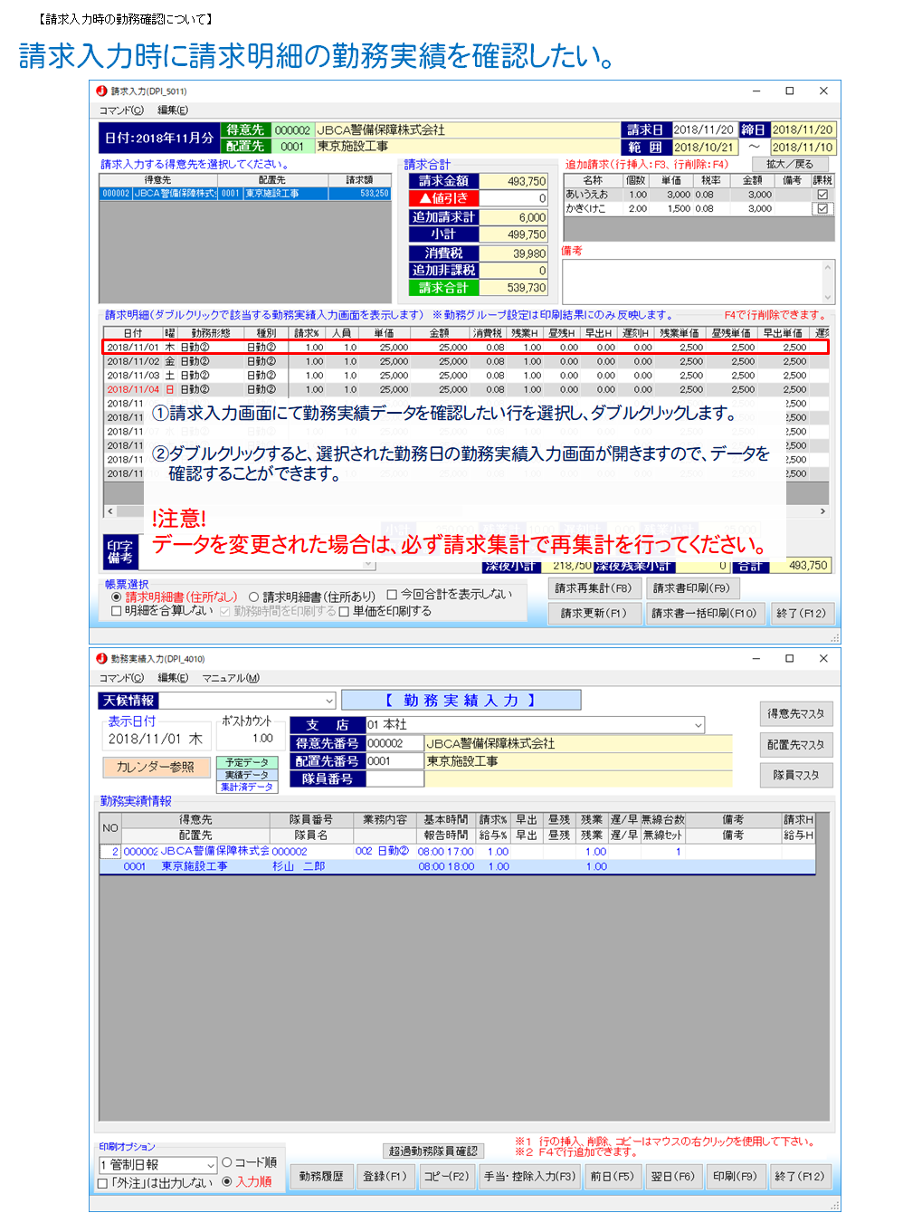 請求入力明細にある確認したい実績の行をダブルクリックすると勤務実績入力画面が開き、
