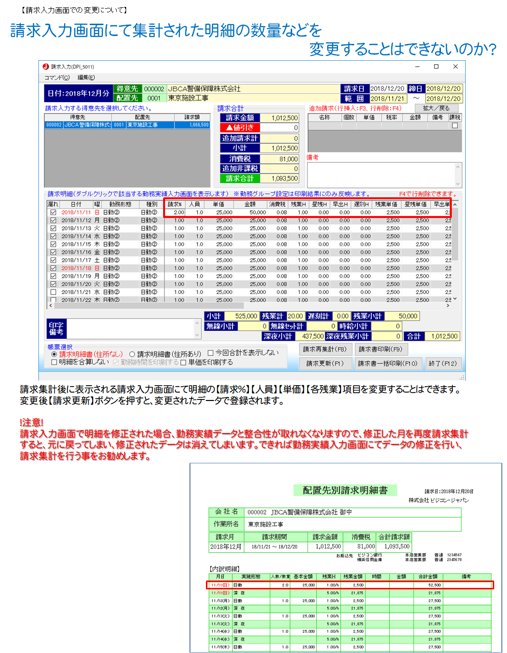 請求入力画面にて直接集計された明細を変更することはできますが、勤務データとの整合性がとれなくなりますので、