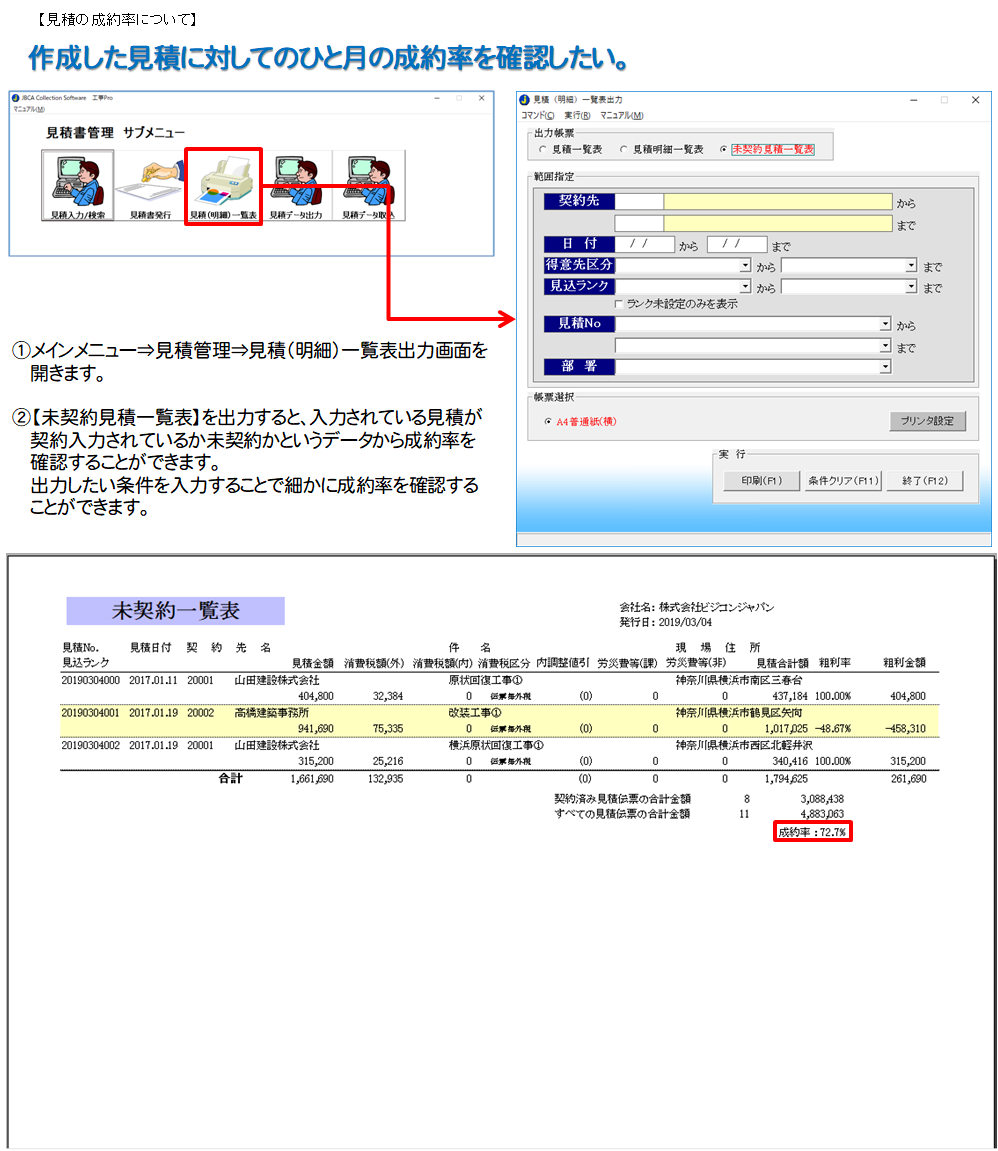 見積(明細)一覧表出力画面より【未契約見積一覧表】を出力すると、作成した見積に対しての成約率を確認することができます。