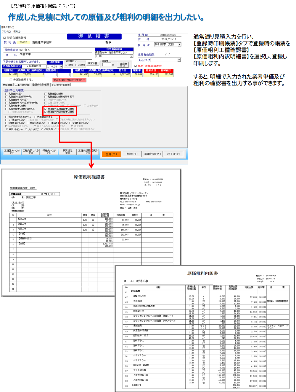 【登録】ボタンを押すと、入力した見積に対する原価及び粗利の帳票を出力する事ができます。