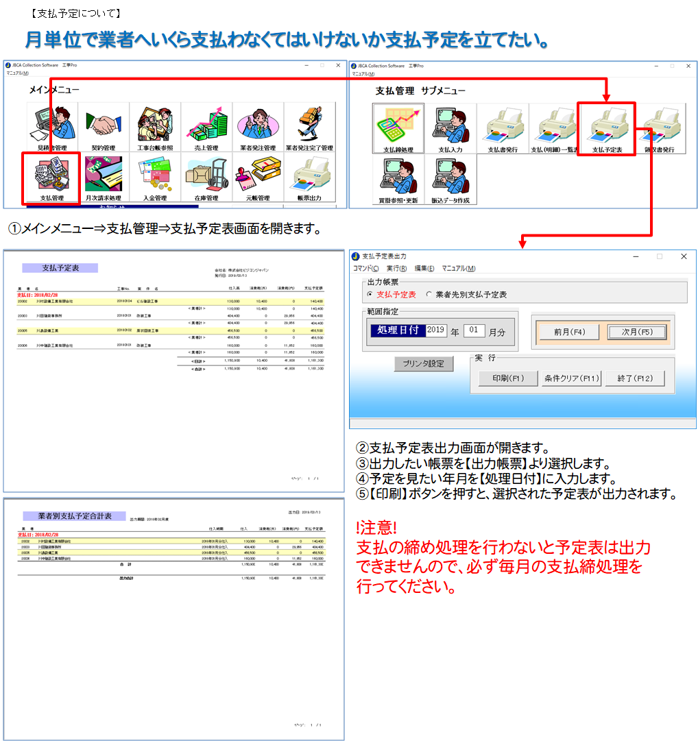 メインメニュー⇒支払管理⇒支払予定表より出力する事ができます。