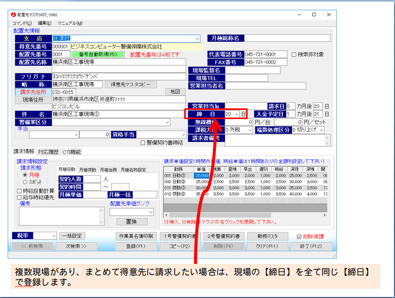 複数現場でまとめて得意先に請求を行う場合は、配置先マスタの締日を統一します。