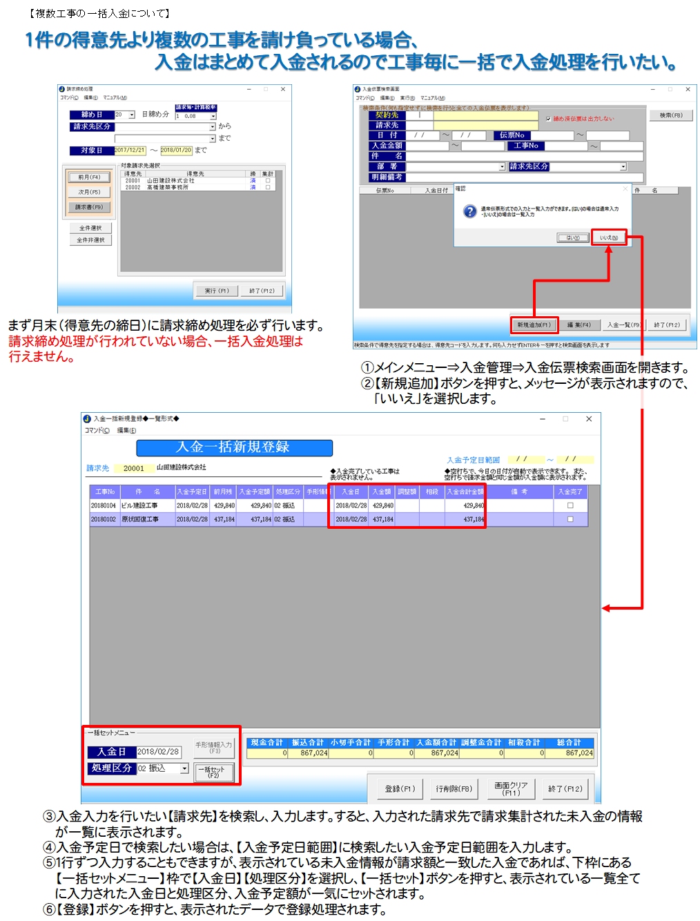 - 1件の得意先より複数の工事を請け負っている場合、入金はまとめて入金されるので工事毎に一括で入金処理を行いたい。