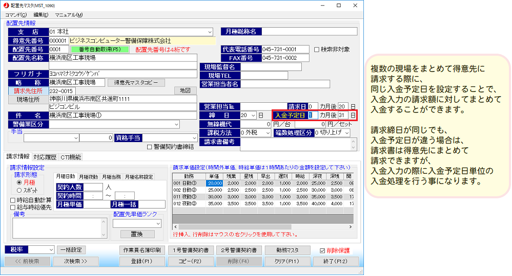 再度、配置先マスタの入金予定日を同じ入金予定日で統一し、再登録します。