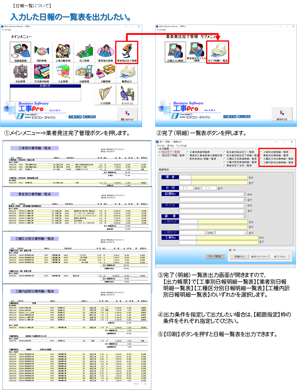 メインメニュー⇒業者発注完了管理⇒完了(明細)一覧表画面より日報明細一覧表を出力することができます。
