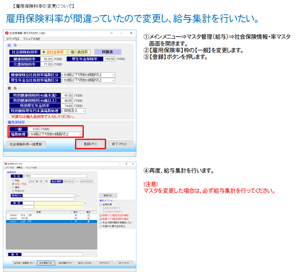 雇用保険料率が間違っていたので変更し、給与集計を行いたい。