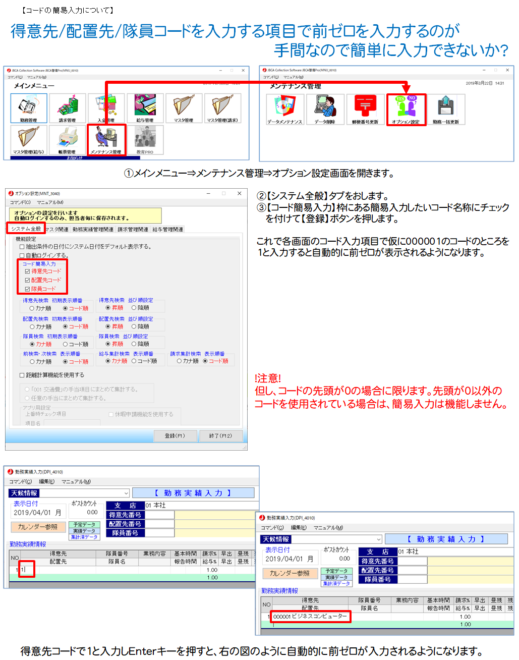 - 得意先/配置先/隊員コードを入力する項目で前ゼロを入力するのが手間なので簡単に入力できないか?