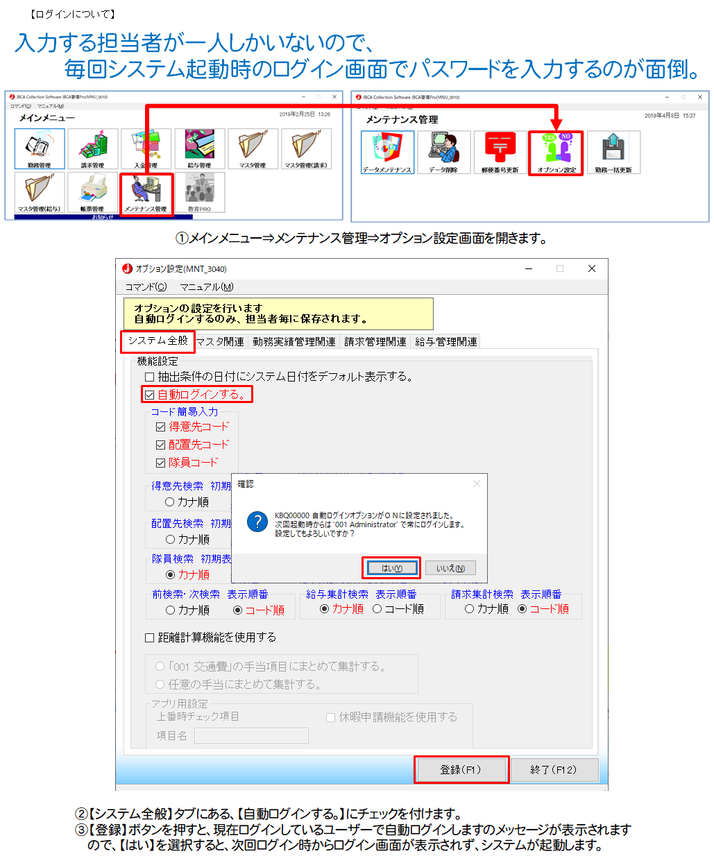 次回システム起動時からログイン画面が表示されず、自動ログインされます。