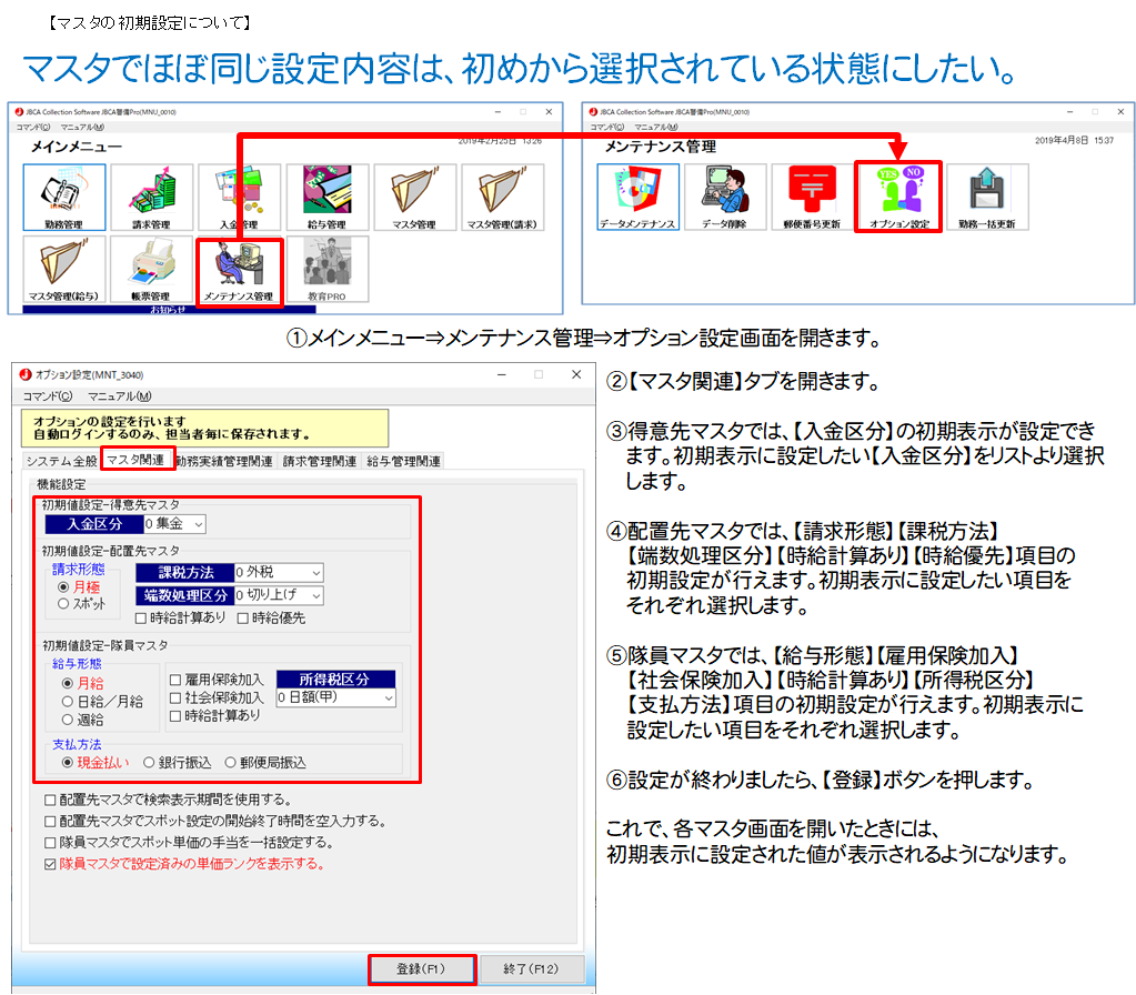【登録】ボタンを押すと、設定された値が各マスタ画面で初期表示されるようになります。
