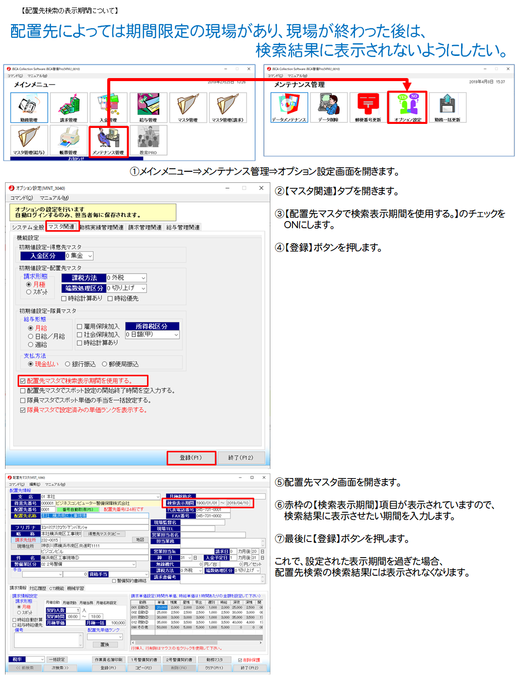 【配置先マスタで検索表示期間を使用する。】にチェックを付けて登録すると、配置先マスタ画面に