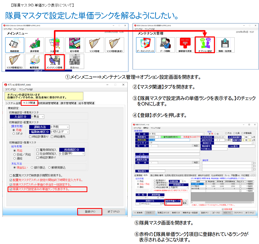 【隊員マスタで設定済みの単価ランクを表示する。】にチェックを付けて登録します。