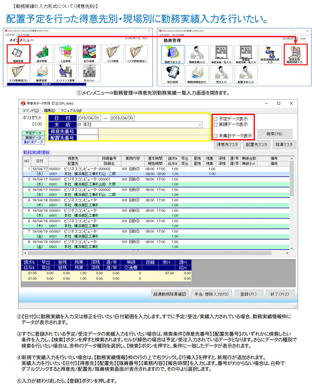 - 配置予定を行った得意先別・現場別に勤務実績入力を行いたい。
