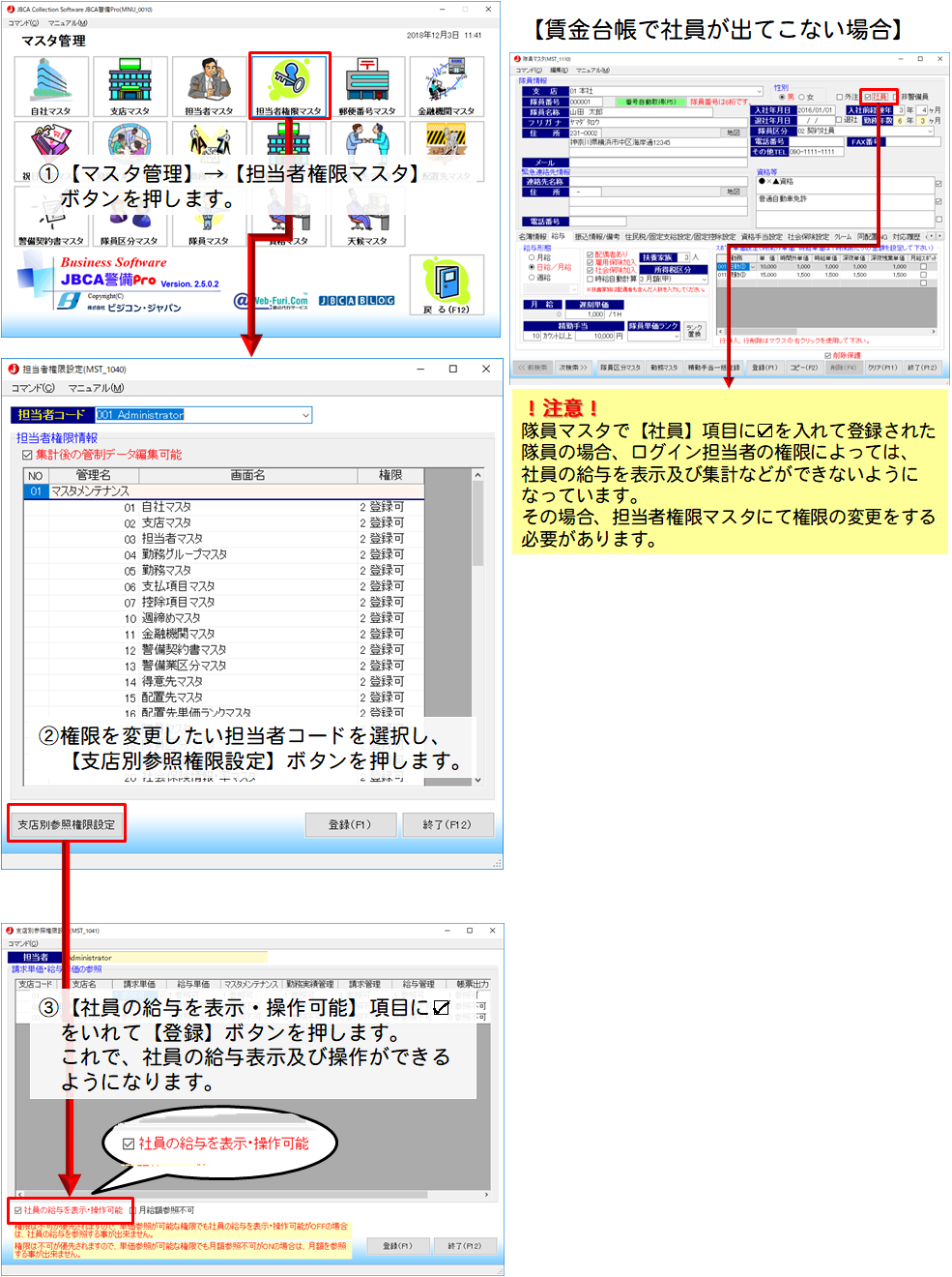 ログイン担当者の権限によっては、社員の給与及び操作ができないようになっています。