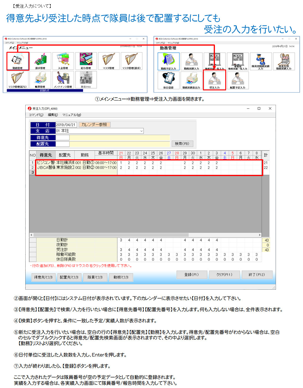 - 得意先より受注した時点で隊員は後で配置するにしても受注の入力を行いたい。
