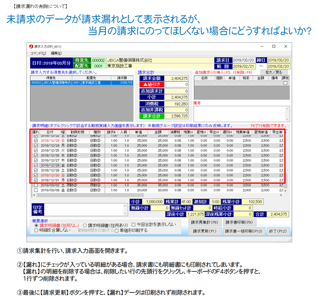 とりあえず応急処置として請求漏れ分の行を行削除で削除すると当月の請求明細にのってこなくなります。