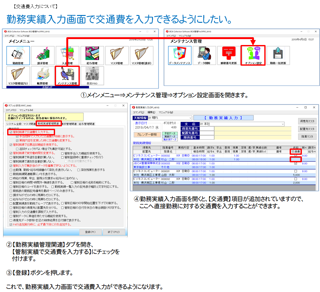 - 勤務実績入力画面で交通費を入力できるようにしたい。