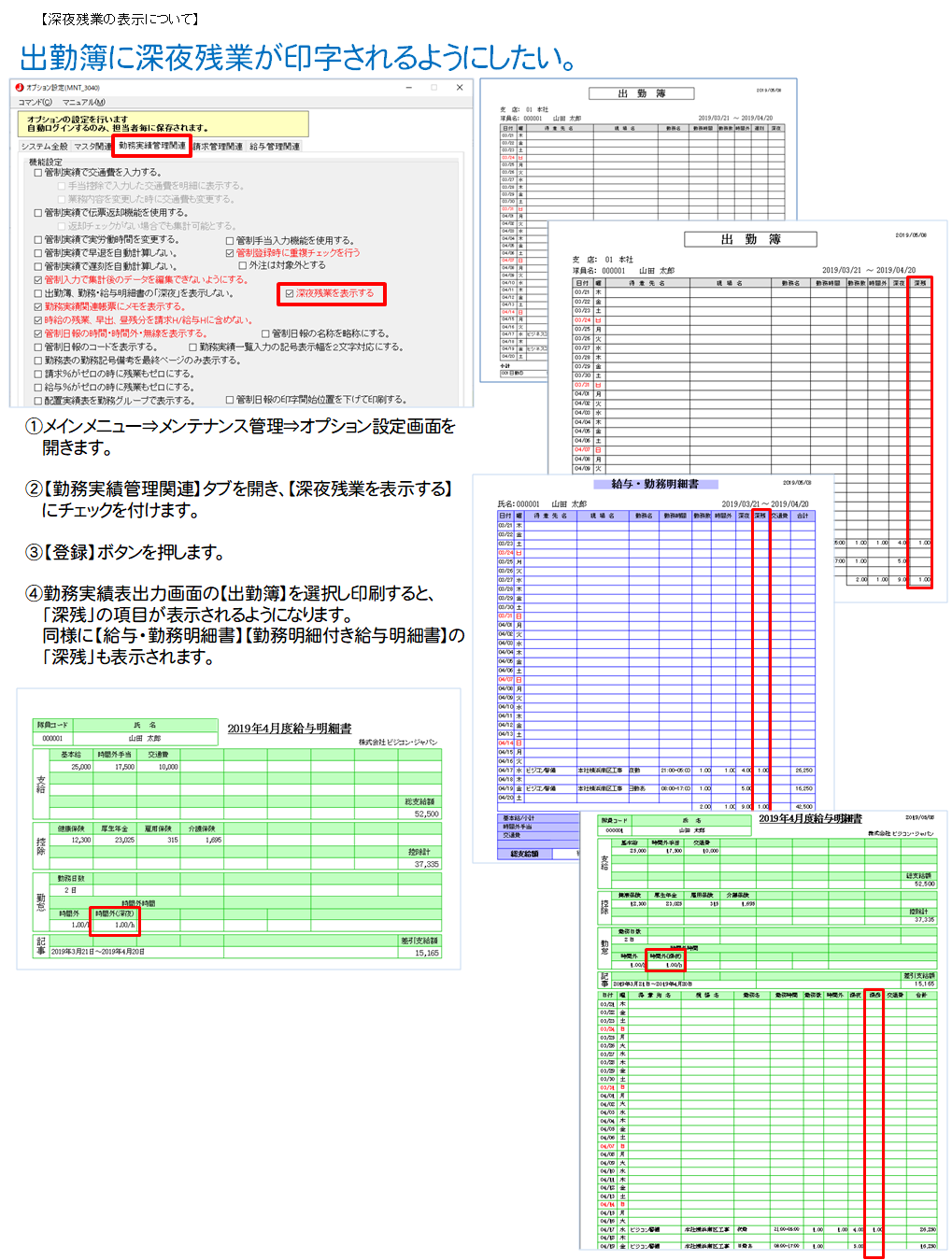 - 出勤簿に深夜残業が印字されるようにしたい。