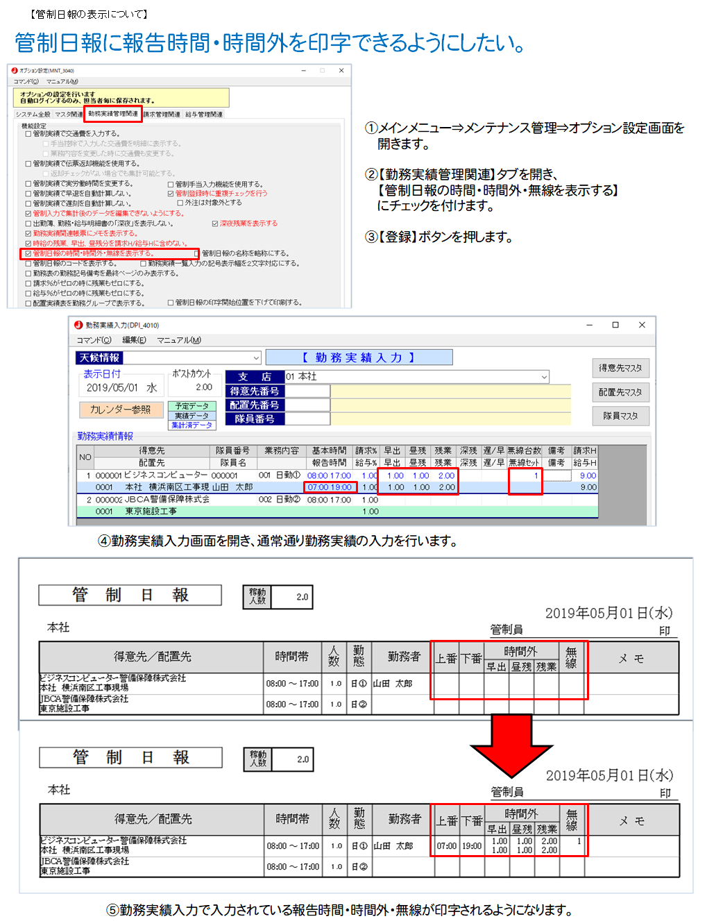 - 管制日報に報告時間・時間外を印字できるようにしたい。