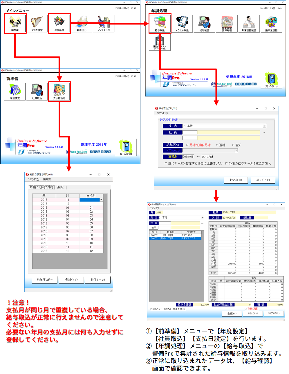 【前準備】→【支払日設定】画面にて【支払月】が同じ月で重複しているデータがありました。