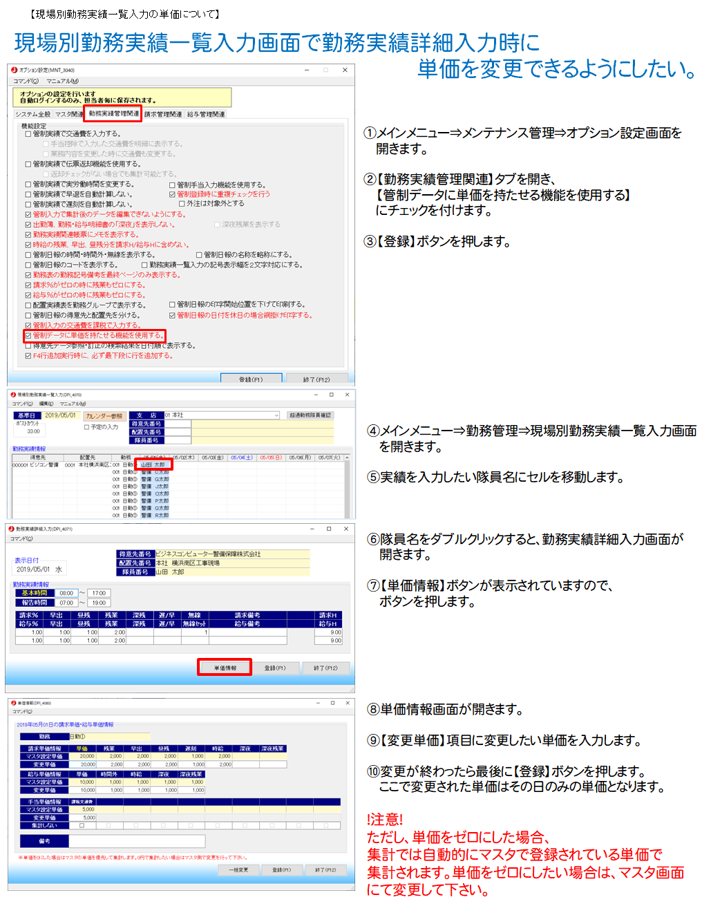 - 現場別勤務実績一覧入力画面で勤務実績詳細入力時に単価を変更できるようにしたい。