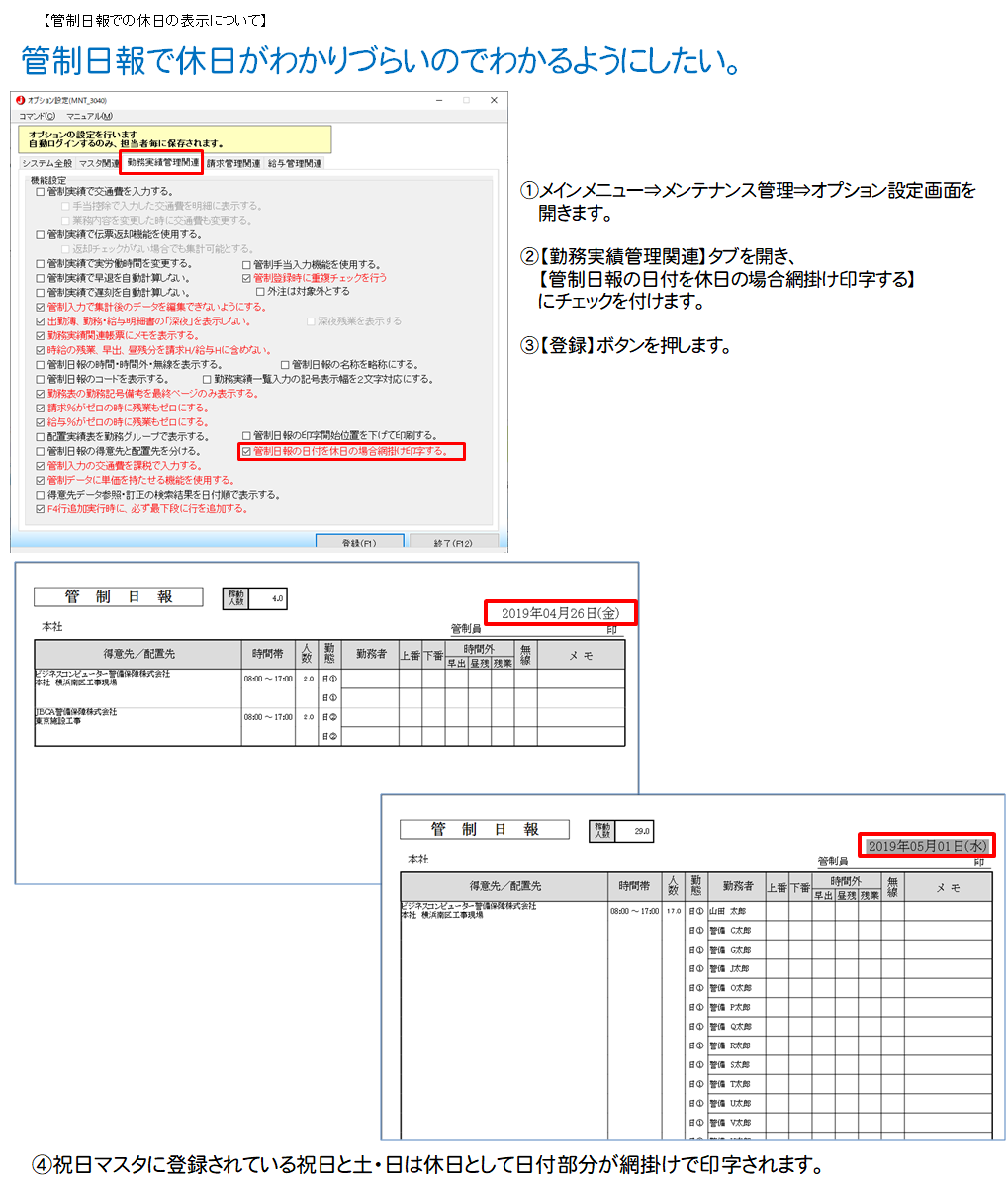 - 管制日報で休日がわかりづらいのでわかるようにしたい。