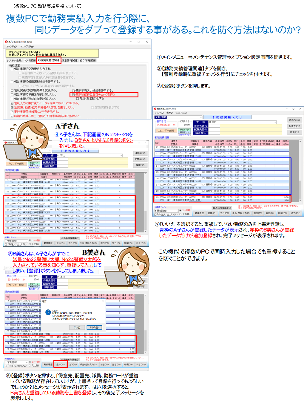 - 複数PCで勤務実績入力を行う際に、同じデータをダブって登録する事がある。これを防ぐ方法はないのか?