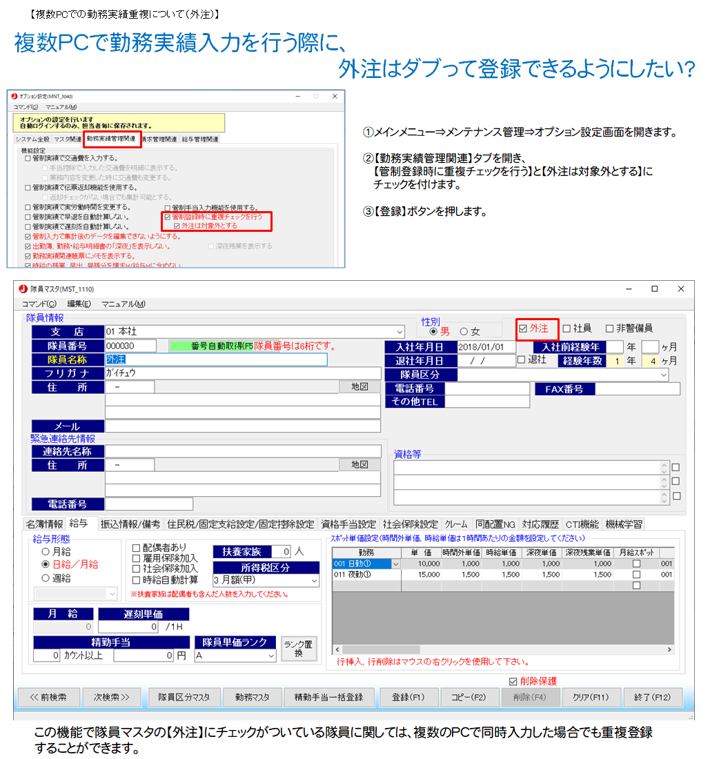 同日の勤務実績入力で仮に別のPC同士で同じデータを登録した際は、隊員マスタで【外注】にチェックが入っていない