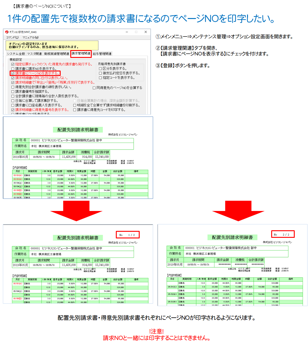 - 1件の配置先で複数枚の請求書になるのでページNOを印字したい。