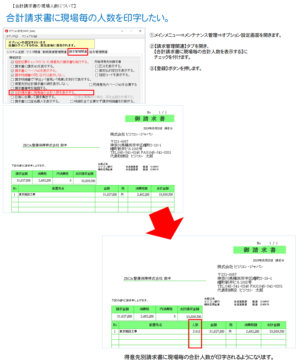 【合計請求書に現場毎の合計人数を表示する】にチェックを付けて【登録】ボタンを押します。