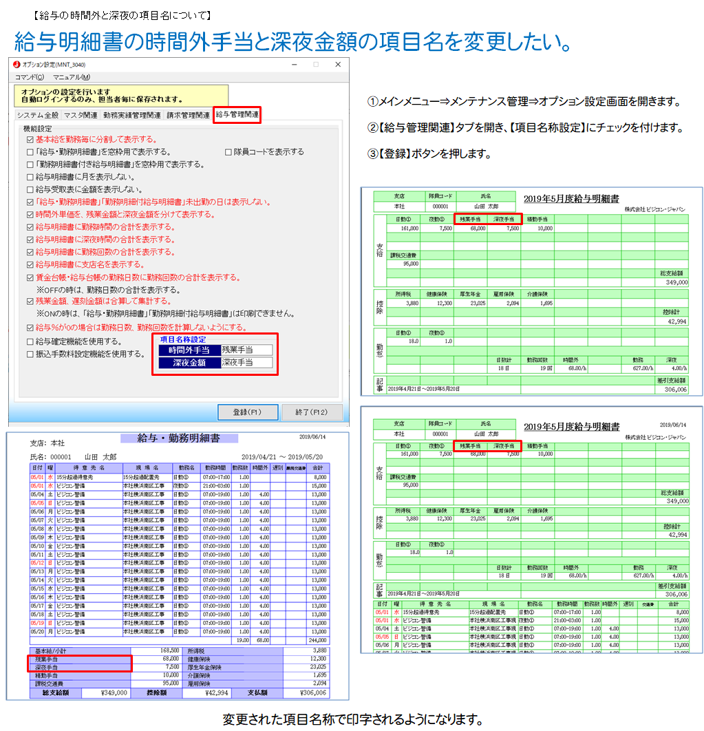 - 給与明細書の時間外手当と深夜金額の項目名を変更したい。