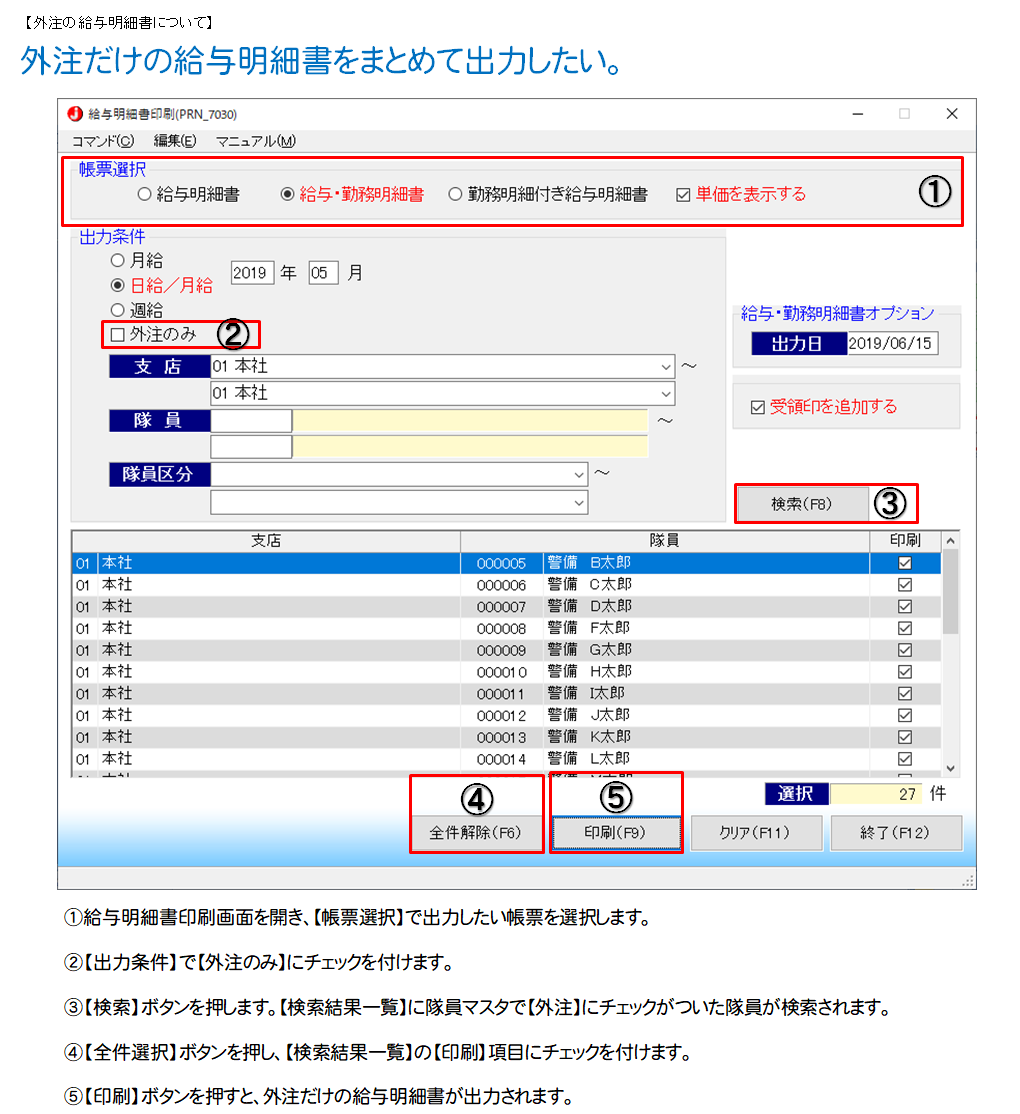 給与明細書印刷画面にある【出力条件】の枠の中の【外注のみ】項目にチェックを付け、【検索】ボタンを押します。