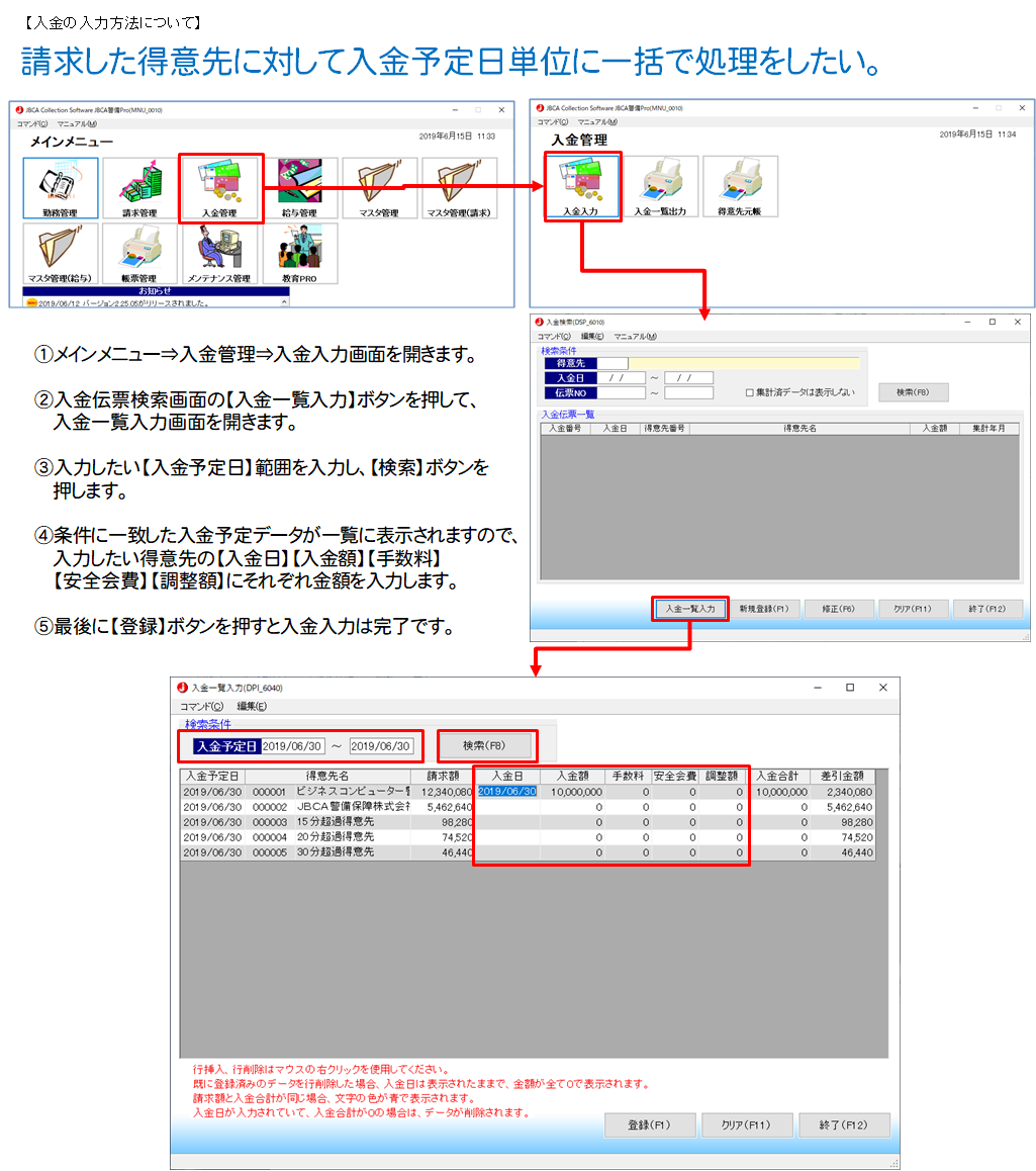 - 請求した得意先に対して入金予定日単位に一括で処理をしたい。
