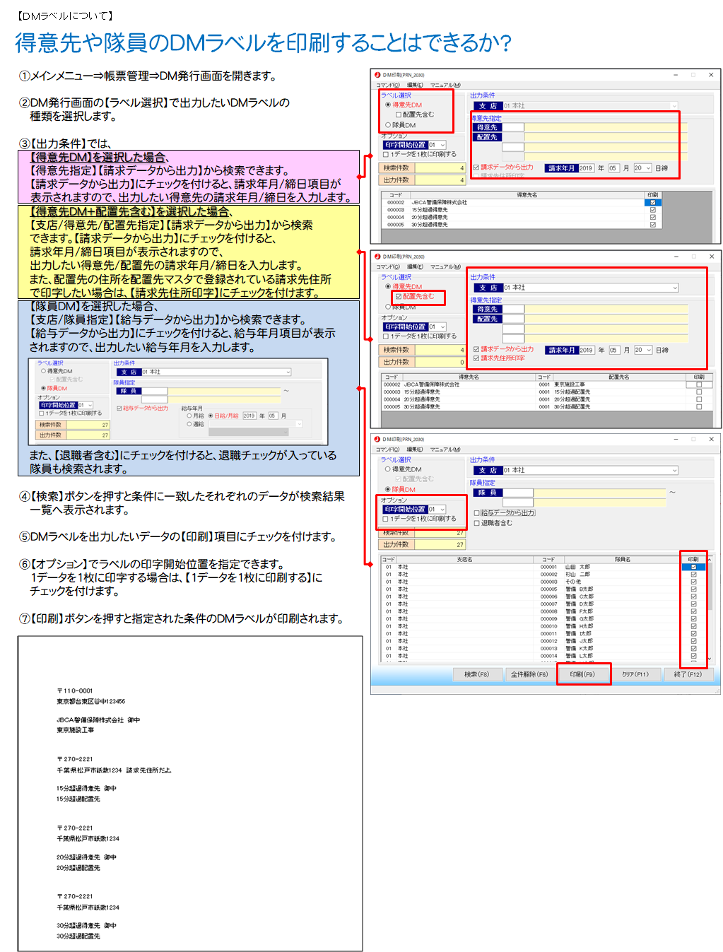 得意先/配置先/隊員の3種類のDM発行ができます。
