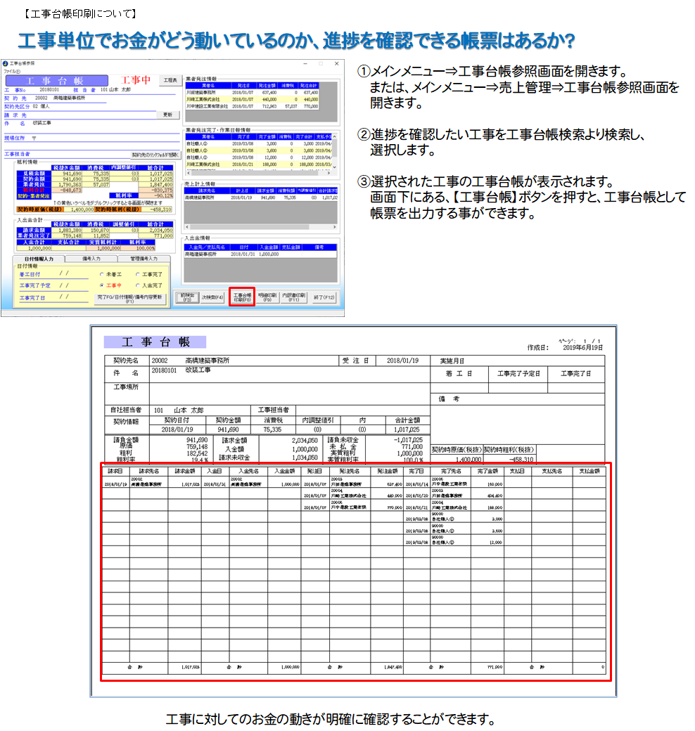 - 工事単位でお金がどう動いているのか、進捗を確認できる帳票はあるか?