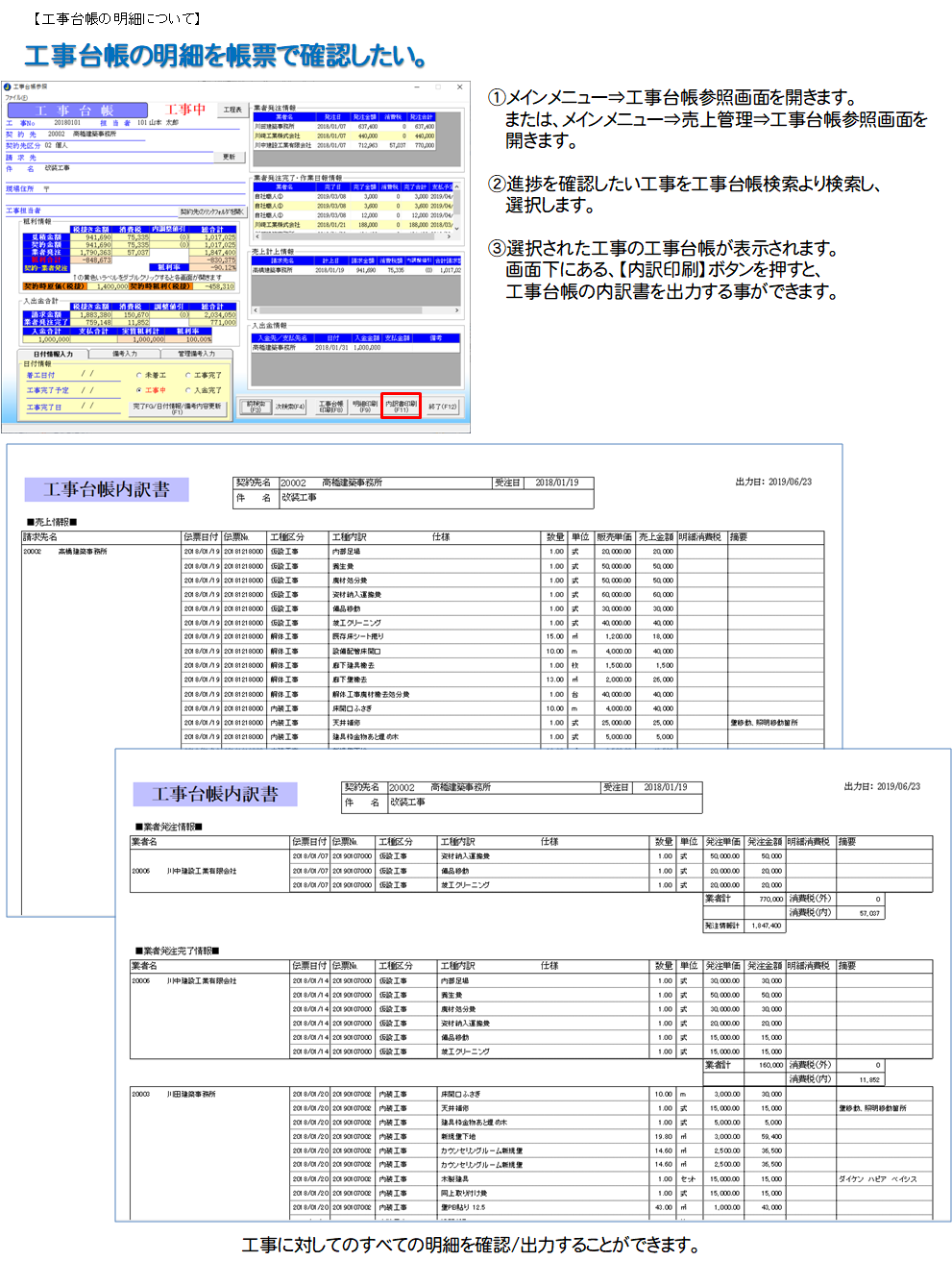 画面の下の【内訳書印刷】ボタンを押すと、工事台帳の内訳書が出力できます。