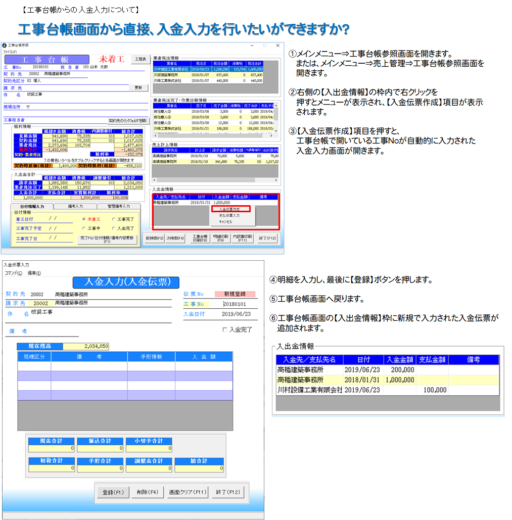 - 工事台帳画面から直接入金入力を行いたいができますか?