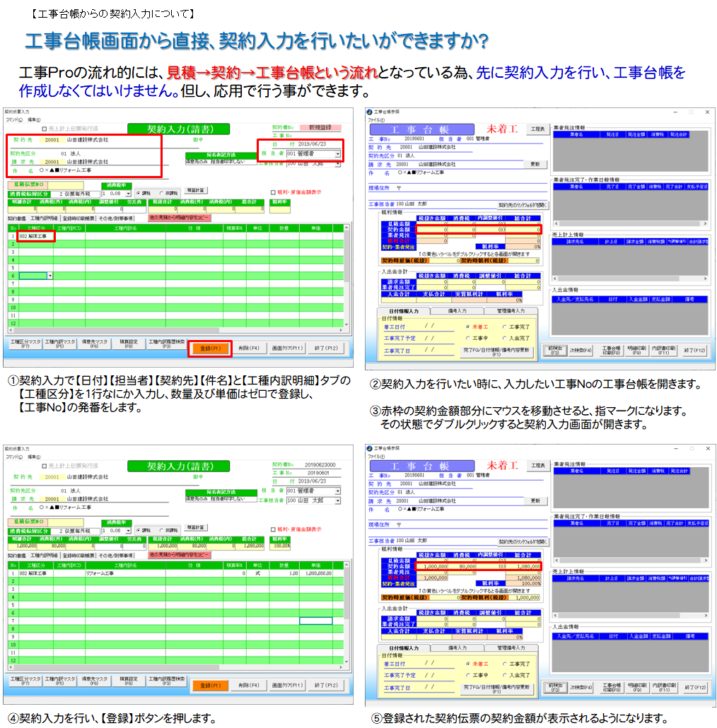- 工事台帳画面から直接契約入力を行いたいができますか?