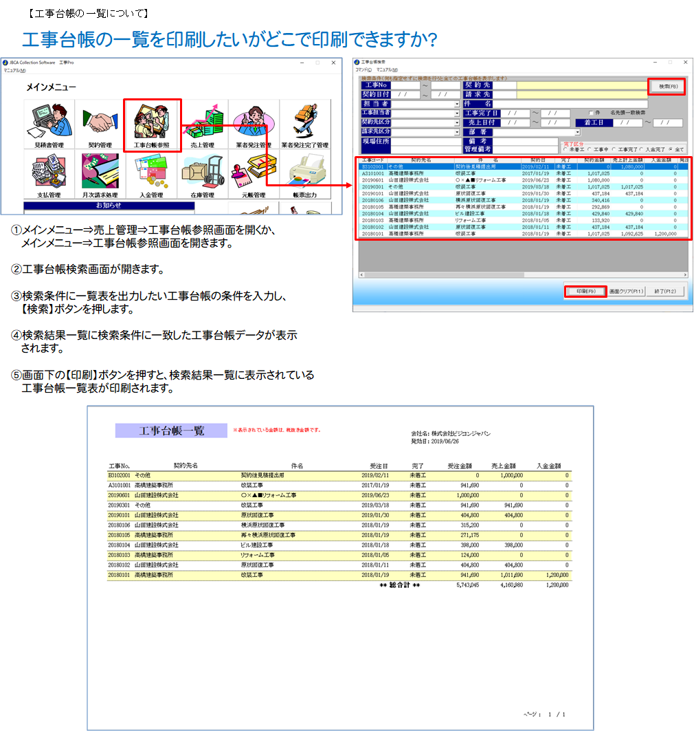 - 工事台帳の一覧を印刷したいがどこで印刷できますか?