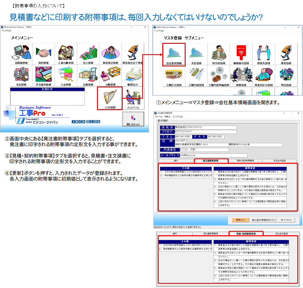 【見積・契約附帯事項】タブには、見積書・注文請書に印字される附帯事項の定形文を入力することができます。