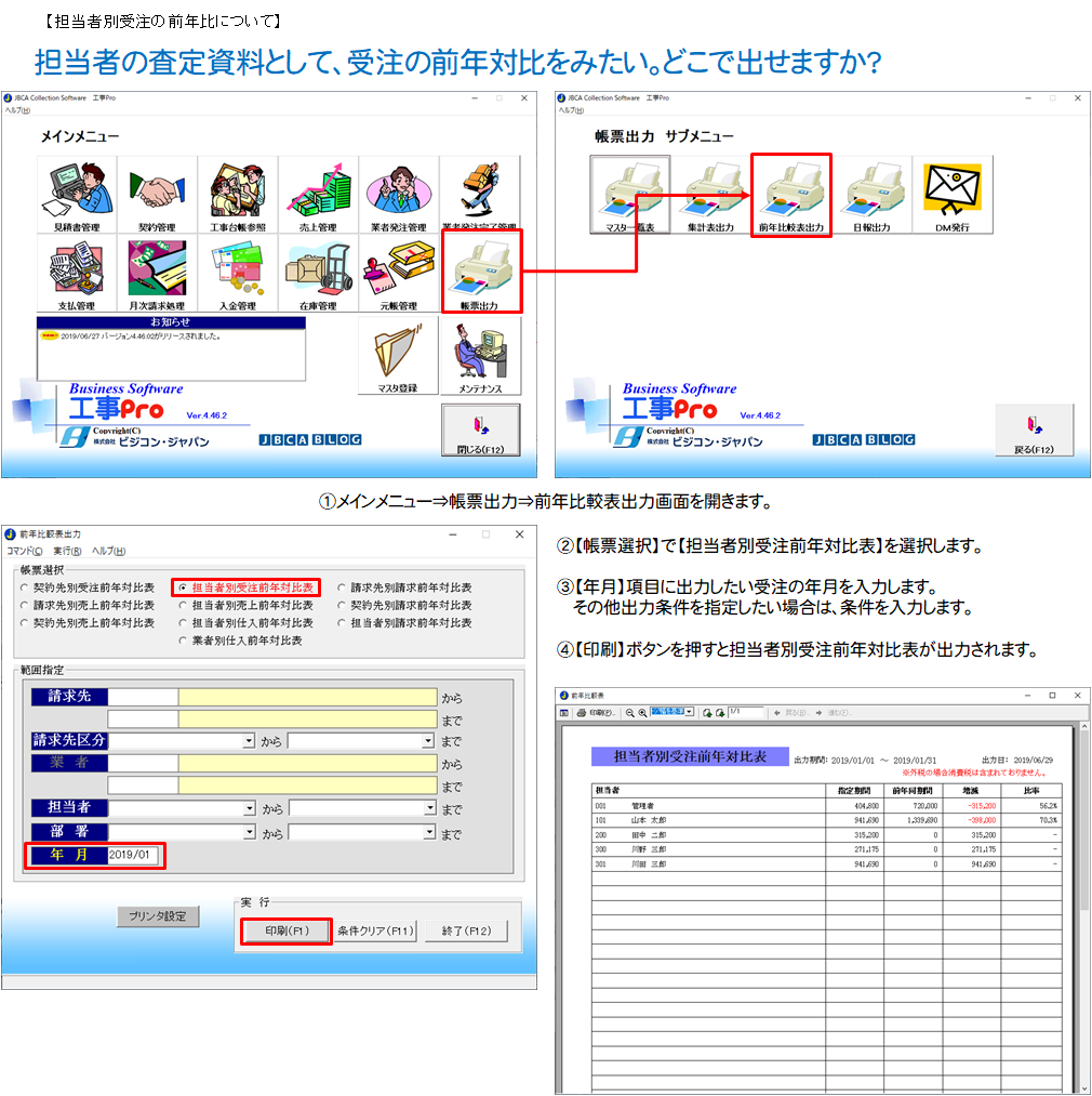 - 担当者の査定資料として、受注の前年対比をみたい。どこで出せますか?