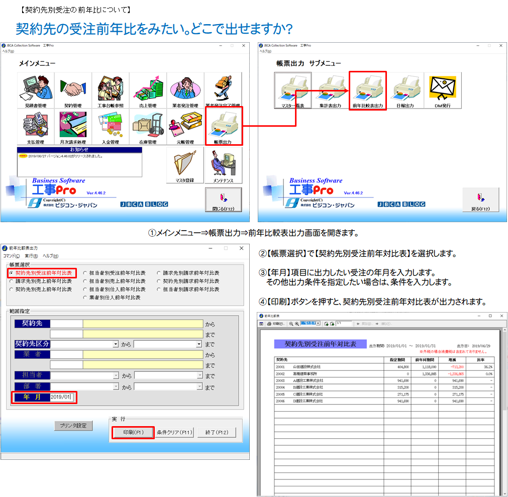 出力したい条件を出力条件に入力し【印刷】ボタンを押すと契約先別の受注前年対比表が出力されます。