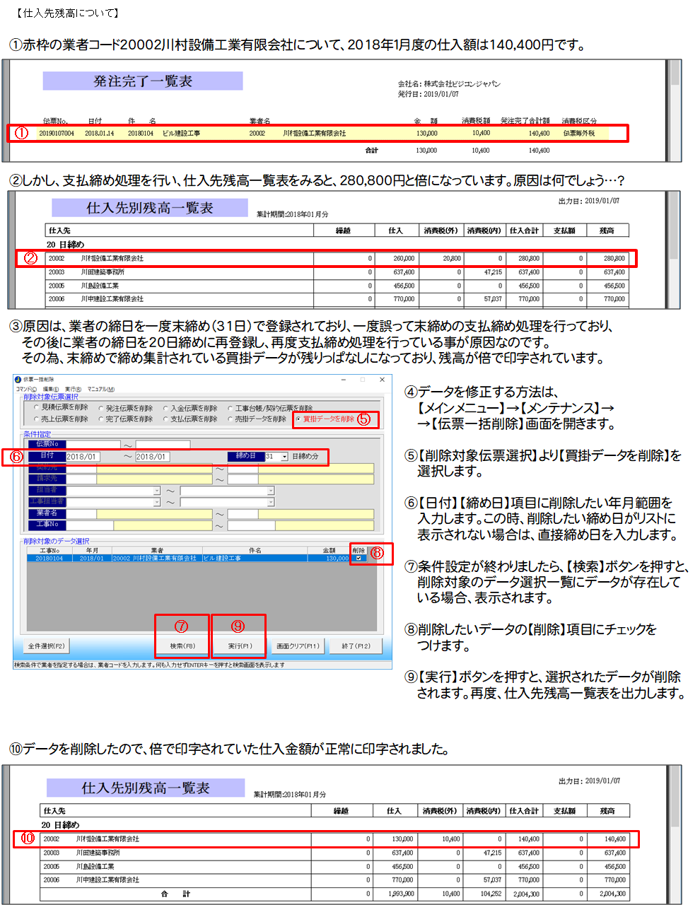 【メンテナンス】→【伝票一括削除】画面にて、末締めの買掛データを削除し、仕入先残高一覧表を出力してください。