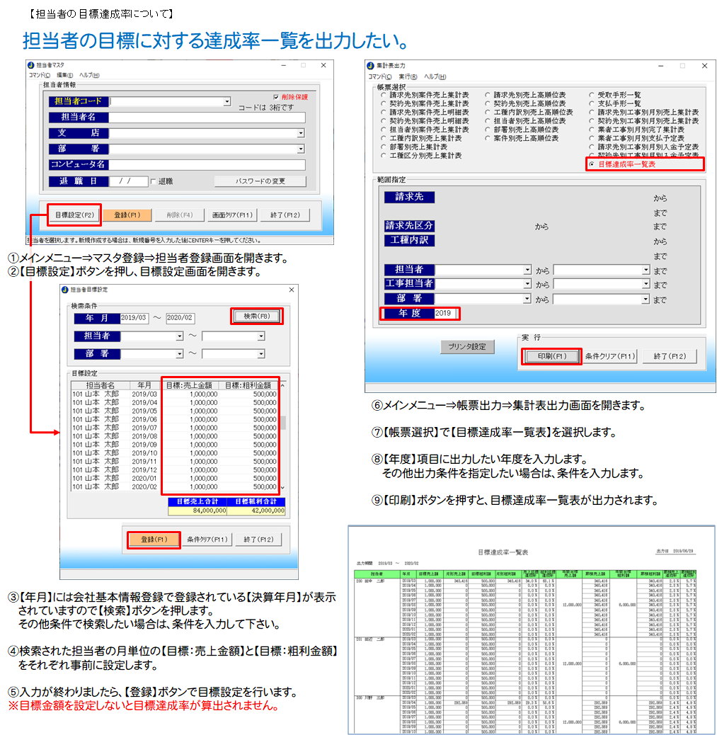 【帳票選択】で【目標達成率一覧表】を選択します。