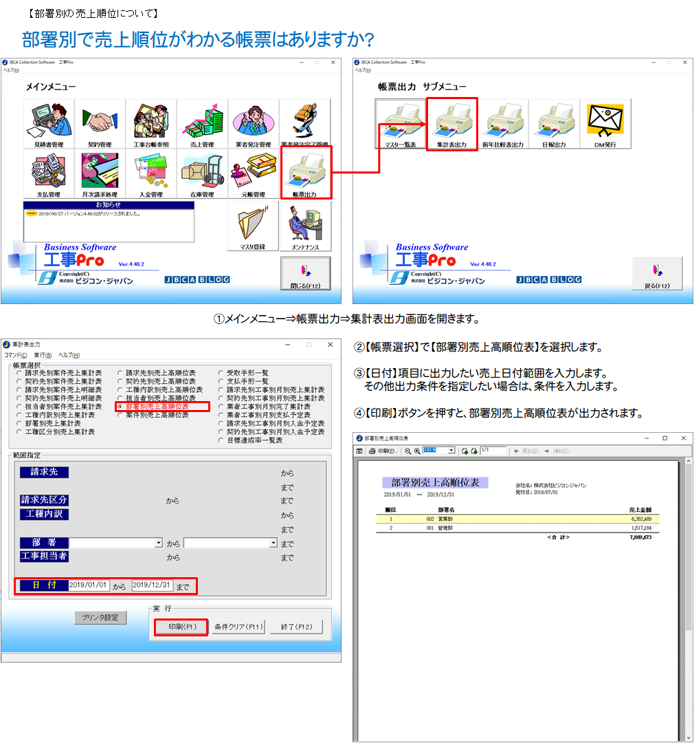 【日付】範囲に出力したい売上日付範囲を入力し【印刷】ボタンを押すと、部署別売上高順位表が出力されます。