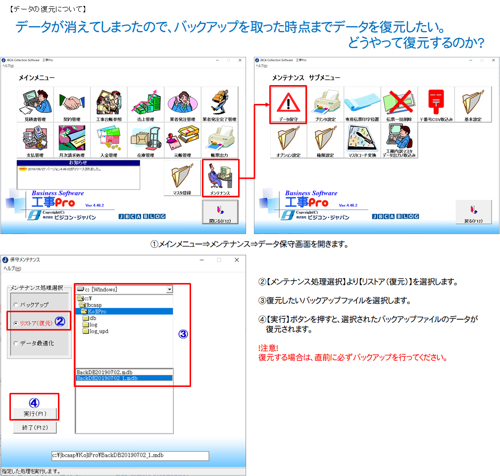 復元する際、直前のデータを必ずバックアップしてから実行してください。