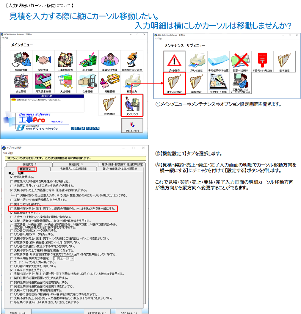 【機能設定1】タブを開き、【見積・契約・売上・発注・完了入力画面の明細でのカーソル移動方向を横→縦にする】に